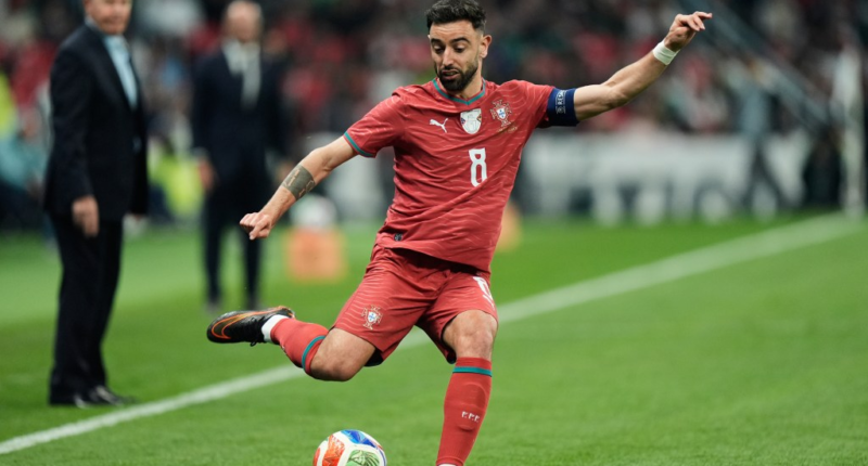 Portugal's Bruno Fernandes passing the ball during a soccer match.